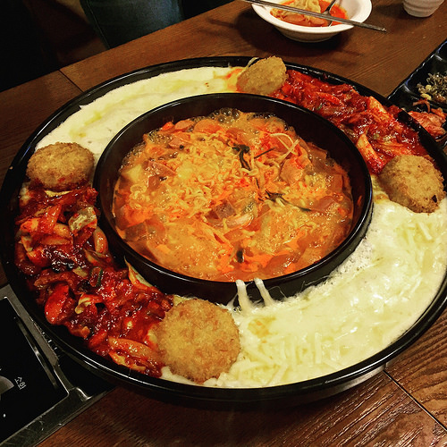 The budae jigae here was interesting and unique in that there was melted cheese around the actual stew. Usually the cheese you just put right into the stew. So never saw this concept before. I mean it was good with the cheese, but somehow i wanted the good ol fashion budae jigae. Like a big pot with a bunch of meat and instant noodles all mixed together. lol. Still I guess it was still good…so won’t mind coming back. But probably will want to try some other normal budae jigae places instead.