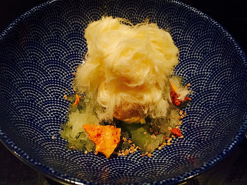 Doesn’t it look like Donald Trump’s hair? Not going to get into politics here, but this was one damn good desert. The desert was called “Honeydew melon, sake granita, passionfruit ice cream, saffron” so yes if you want to release some anger about trump and want to eat his hair or something, come to Bar H.