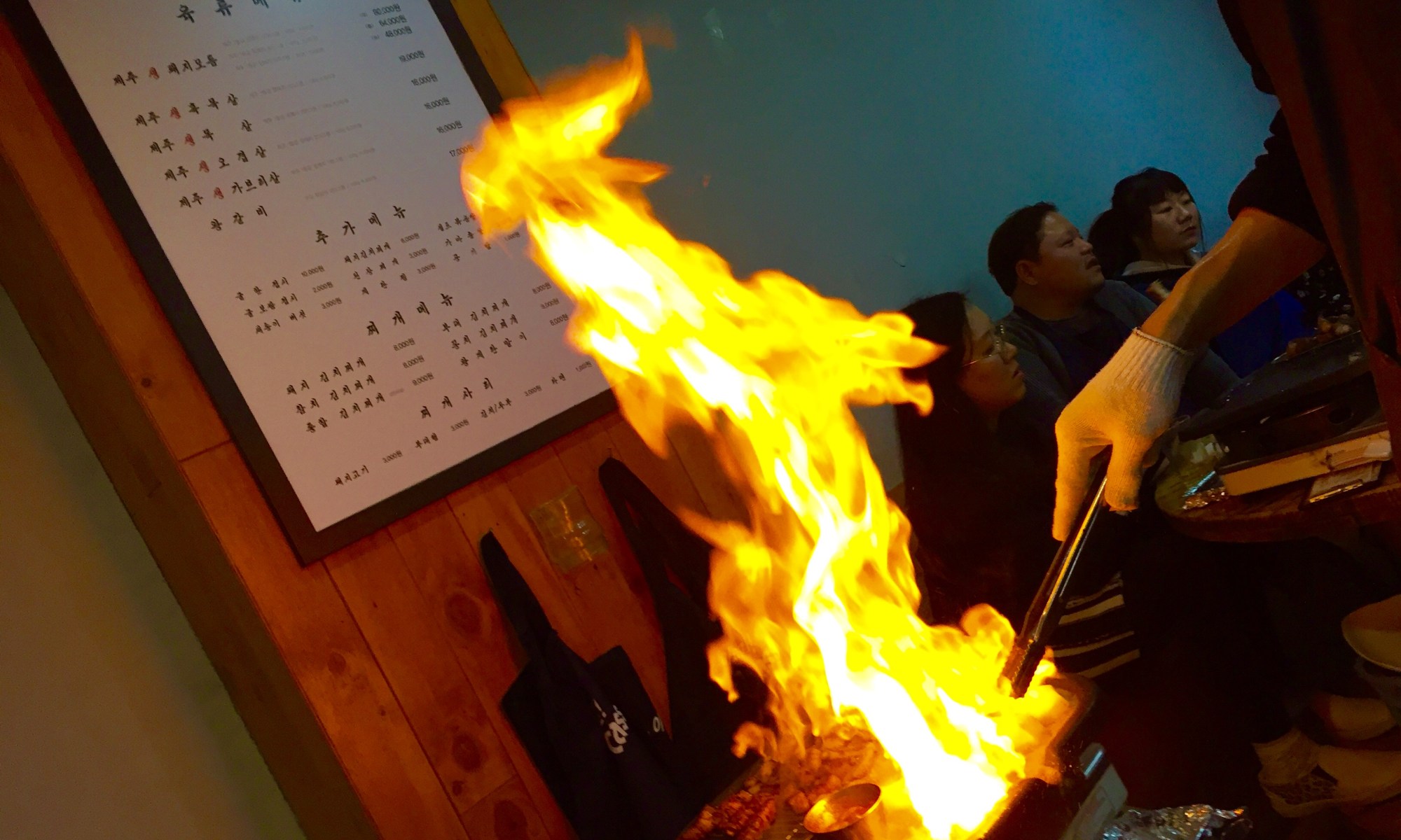 We ordered pork belly or something like that. It was raw (duh). Until this guy came with a can and started throwing flames on the barbeque and proceeded to light the grill on fire.