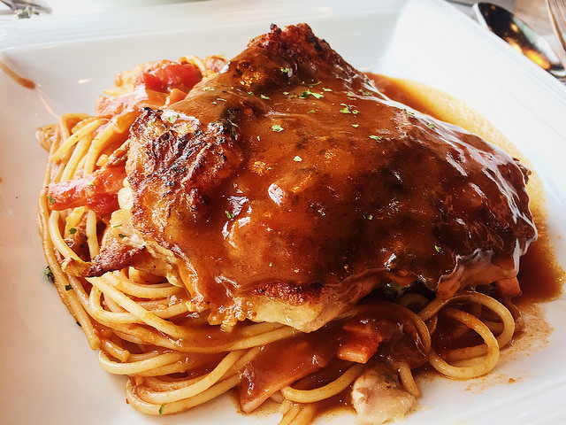 I cleaned out my dish, still had tomato sauce around my lips, and my right hand was holding the fork with the last piece of my chicken.