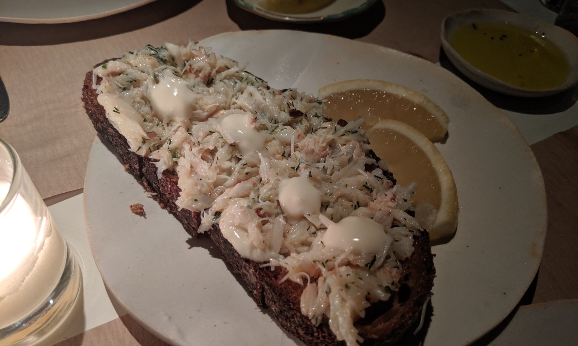 For mains she got the salmon, I got the mushroom pizza for mains. The pizza was meh, nothing special. I prefer my pizzas with tomato sauce base, but this one didn’t have much. I guess I should have asked about it. The salmon per life boss was fresh (which is the motto of the restaurant). Well having fresh ingredients should be the basic expectations for all restaurants, so not sure how impressed I am with that. The calamari to me was the winner. So damn fresh and good. We also got this crab meat on toast which life boss really liked. I was okay about it, wasn’t going crazy.